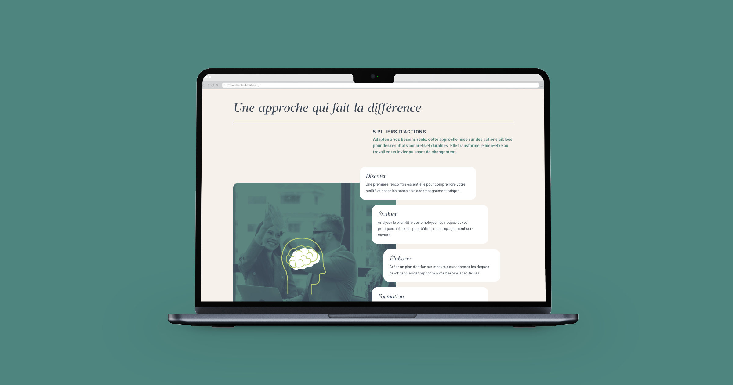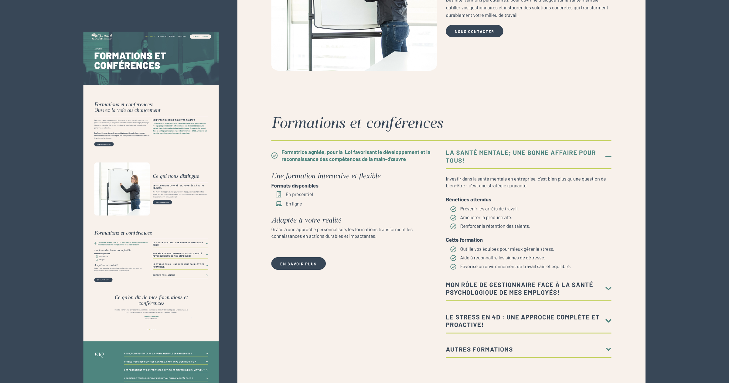 Nous avons entièrement revu la structure de l’information pour mettre en valeur son approche unique et ses trois services : formations et conférences, parcours d’impact durable, et évaluation/mise en action. De l’arborescence à l’intégration, en passant par le UX, le UI et la rédaction, nous avons conçu un site qui incarne son professionnalisme et sa mission : « détaboutiser » la santé mentale en entreprise.